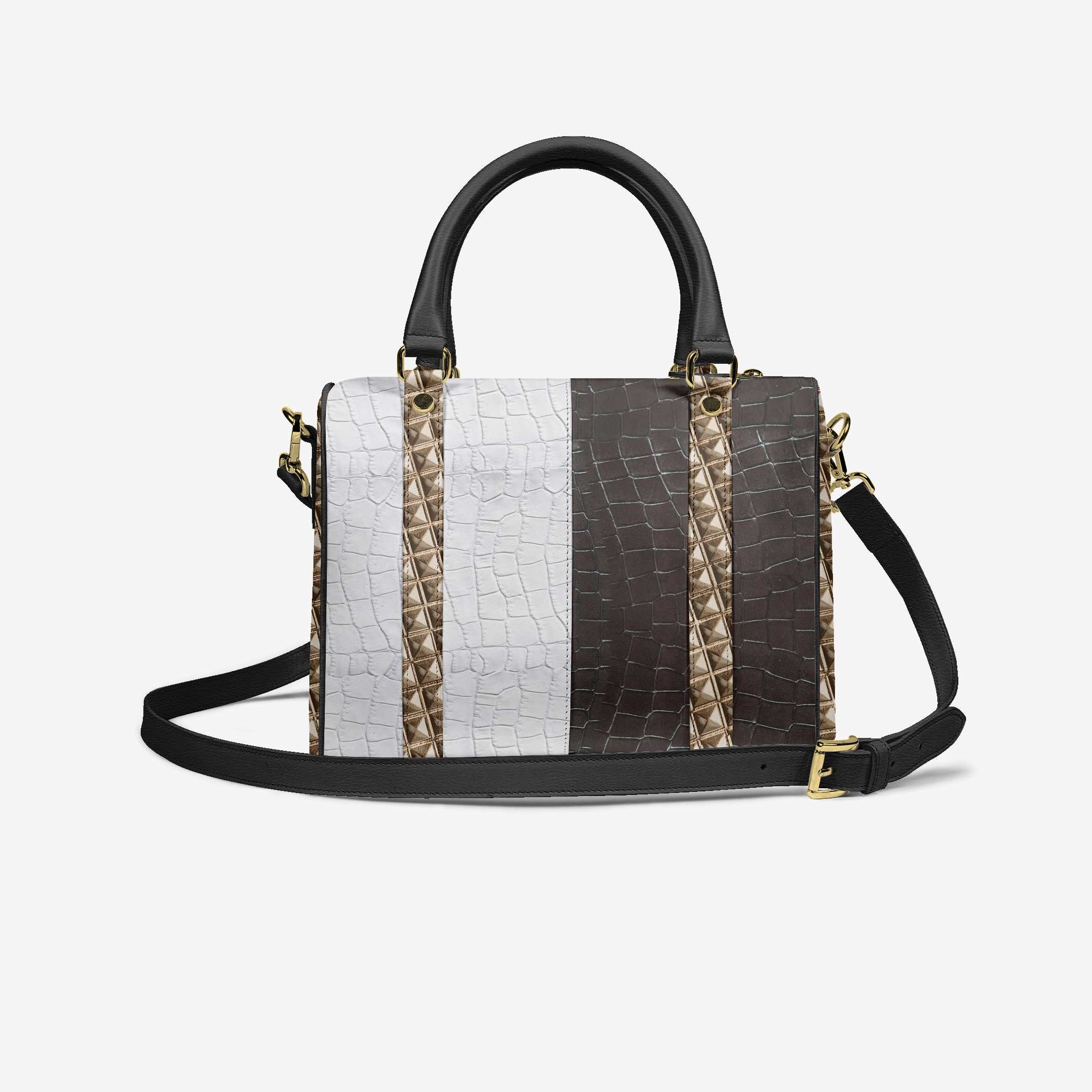 Embark on a journey of extravagance with this stylish luxury bag featuring a front flap with two bands and a logo in a pendant. It has a long shoulder strap with metallic embellishments for added glamour.